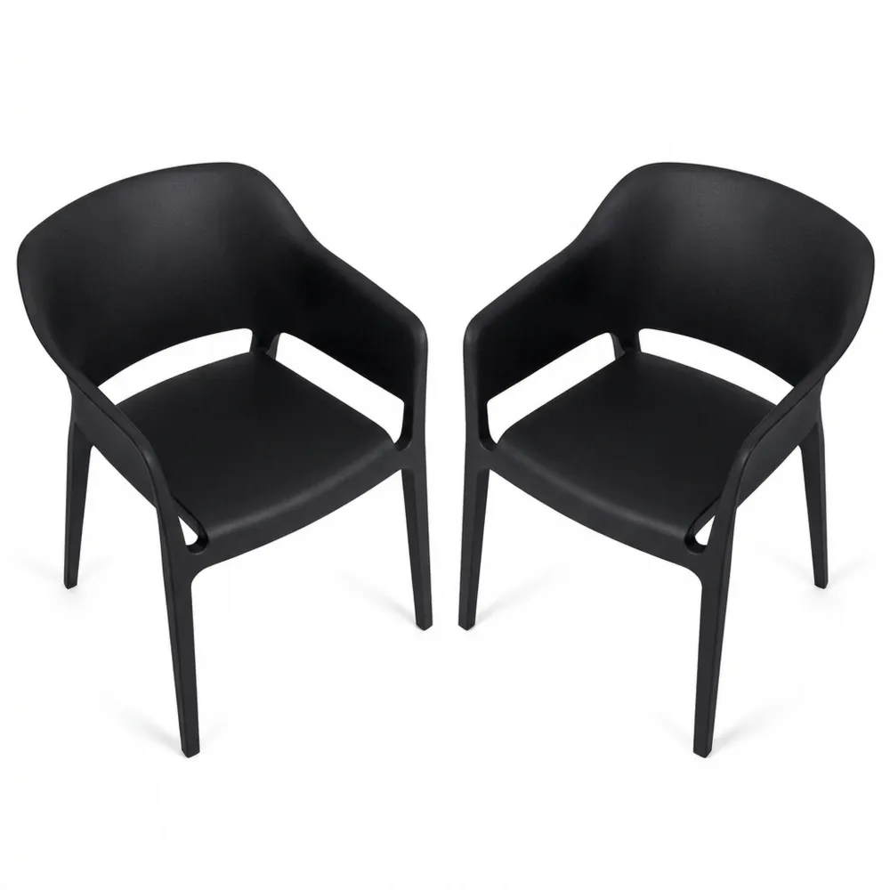Moderner Gartenstuhl 2er Set, stapelbar und wetterfest, mit festen Armlehnen, Kunststoffrahmen, Farbe: schwarz