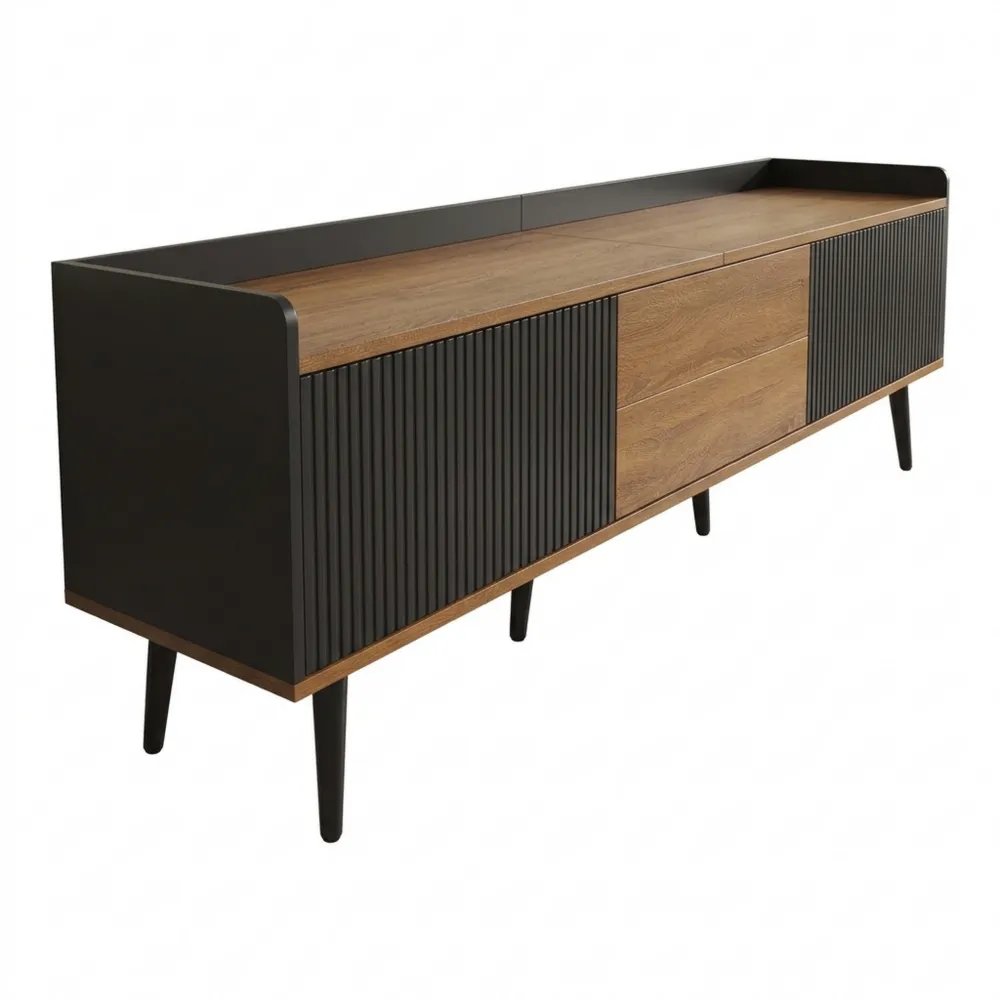 Der TV-Schrank unterstützt eine ordentliche Aufbewahrung von Medien, Spielen und Decken. Die Kombination aus Schwarz und Holzfinish schafft eine einladende Atmosphäre.