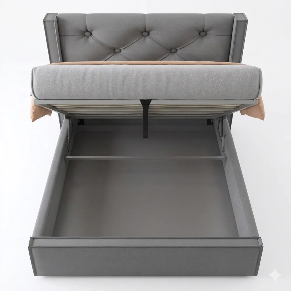 Stauraumkonzept: Großer Bettkasten unter dem hochklappbaren Lattenrost für Decken, Kissen oder Bettwäsche, leicht zugänglich durch Hubzylinder. Oxford-Tuch an der Unterseite schützt vor Staub.