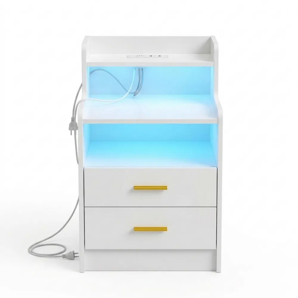 Der Nachttisch verfügt über eine integrierte Steckdose mit zwei Wechselstromanschlüssen und zwei USB-Anschlüssen, ideal zum Aufladen von Geräten wie Handys und Tablets. Ausgestattet mit RGB-LED-Lichtern, die 16 Farben und mehrere Modi bieten, lässt sich die Beleuchtung per Fernbedienung anpassen. Hergestellt aus einer umweltfreundlichen Spanplatte mit einer Stärke von 16mm bietet der Nachttisch Stabilität und Haltbarkeit. Mit einer Größe von 40x45x76cm und drei Schubladen sowie zwei Trennwänden bietet er ausreichend Stauraum für kleinere Gegenstände. Der Nachttisch ist für moderne Wohnräume geeignet, einschließlich Schlafzimmer, Wohnzimmer und Kinderzimmer.