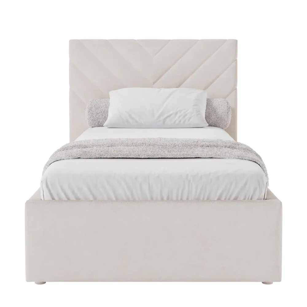 Der Cloud-Stoffbezug bietet eine Kombination aus Langlebigkeit und Funktionalität. Das Material ist wasserabweisend und resistent gegen Staub und Tierhaare. Flecken lassen sich leicht mit einem feuchten Tuch entfernen. Der Bettkasten im Rahmen bietet Platz für Bettwäsche und Decken. Das Metallgestell mit Gasdruckfedern ermöglicht einfaches Öffnen. Der Rahmen aus laminierten Platten sorgt für Stabilität. Anstelle klassischer Füße schützen Gleiter den Boden. Das gepolsterte Kopfteil mit dekorativer Steppung dient als Rückenlehne. Die Sitzhöhe von 30 cm erleichtert das Hinsetzen und Aufstehen. Das Modell wird ohne Matratze geliefert.