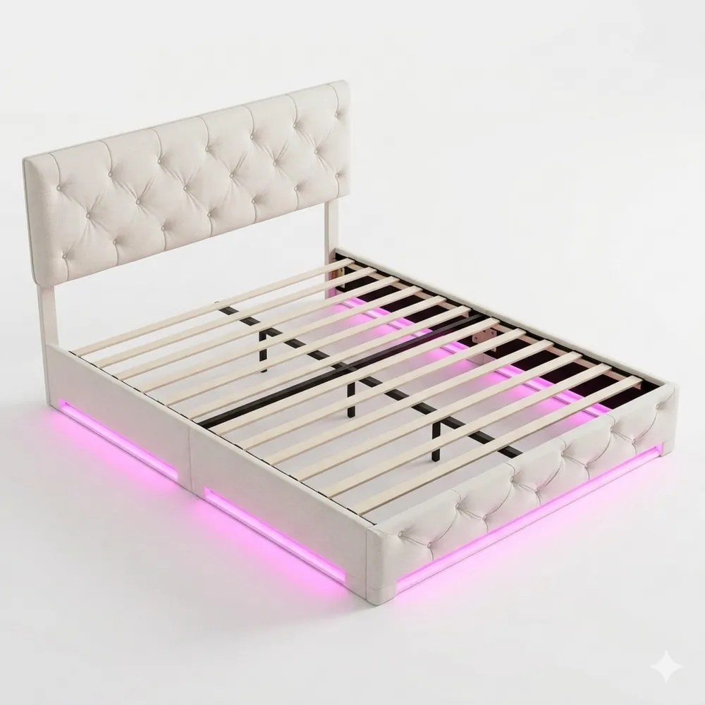 Der Bettrahmen ist aus hautfreundlichem Leinen und bietet ein angenehmes Polstererlebnis. Er ist wasserabweisend und atmungsaktiv, was Feuchtigkeit und Hitze reduziert. Die leichte Reinigung erleichtert die Pflege. Das Bett verfügt über einen hydraulischen Stauraum mit großem Platz unter dem Bett, der mit einem einfachen Lift zugänglich ist. Das Kopfteil ist höhenverstellbar und passt sich Matratzen unterschiedlicher Größe an. Der Bettrahmen hat eine robuste Konstruktion mit einer Tragkraft von bis zu 250 kg. Er ist auf Langlebigkeit und Stabilität ausgelegt. Der benutzerfreundliche hydraulische Doppelhubmechanismus und der stabile Mittelträger bieten zuverlässigen Halt. Die Montage ist einfach und erfordert kein zusätzliches Werkzeug.